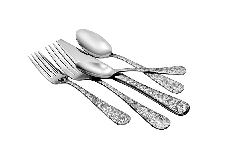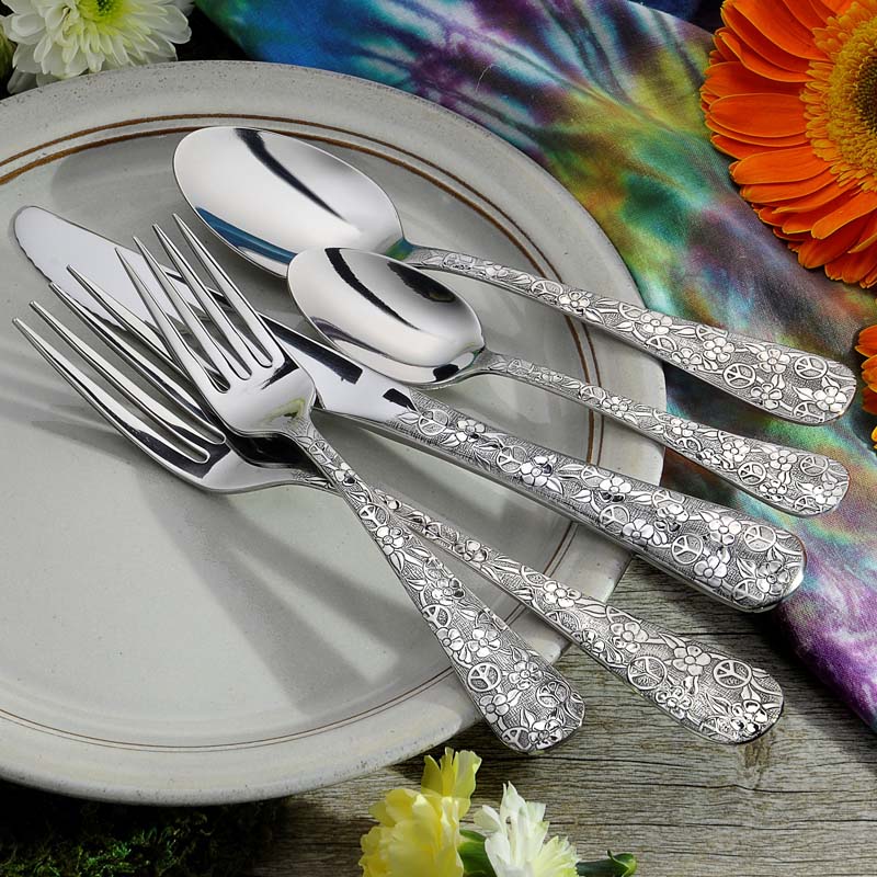 Woodstock is a unique and creative pattern that is bound to take you back to a groovier time. The artistic design on this beautiful pattern is ‘far out’ and the attention to detail is noticeable. Let peace, love and music rock your dinner table today! Add some flower power to your home with Woodstock flatware!